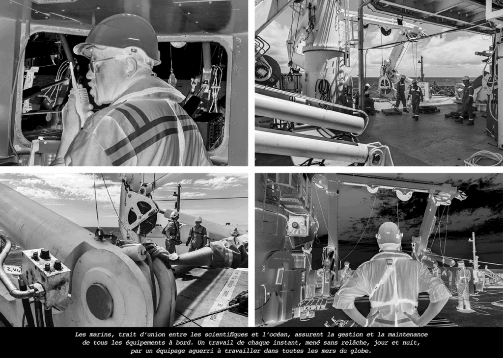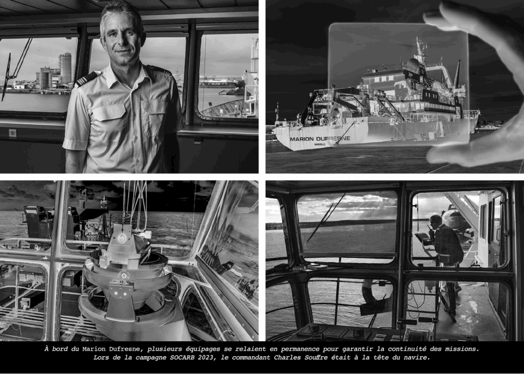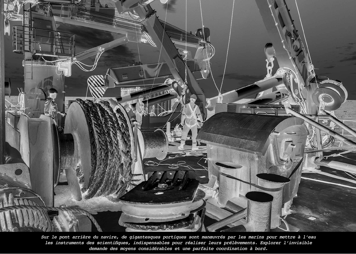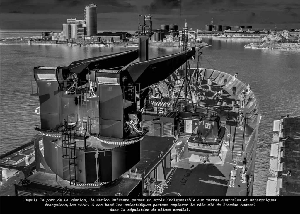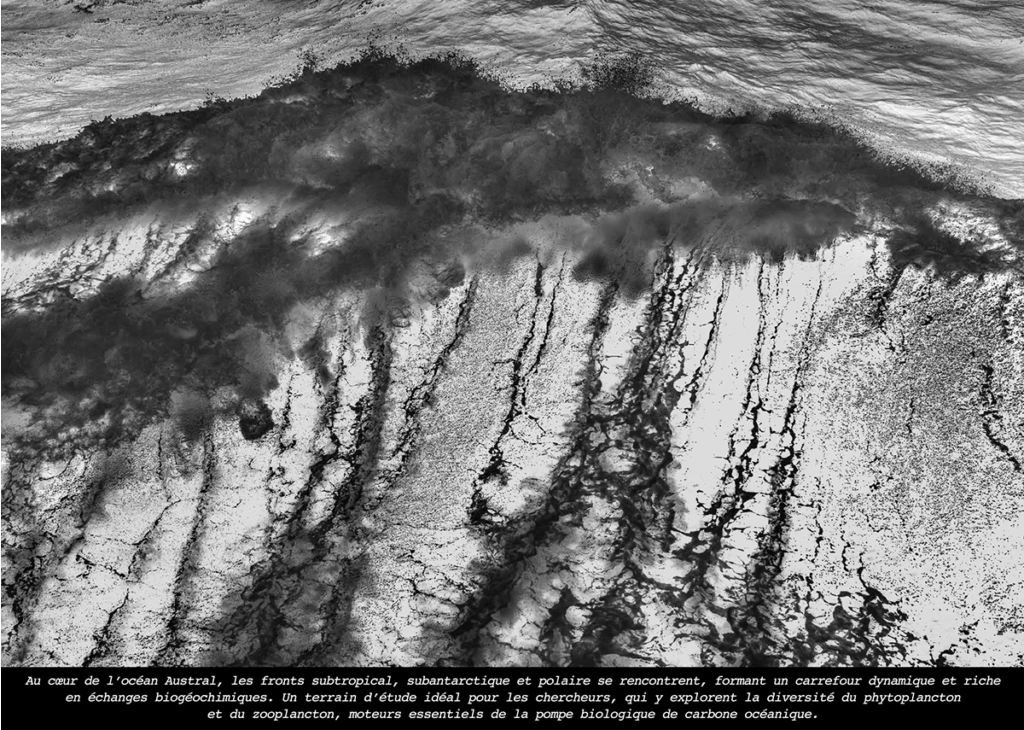Austral, les engagés pour l’Océan nous entraîne dans les entrailles de la recherche océanographique au large des Terres Australes et Antarctiques françaises. Cet essai photographique, réalisé à bord du Marion Dufresne, propose une autre manière de raconter l’Océan : non pas comme un simple objet d’étude ou une carte postale attendue, mais comme une aventure sensible, poétique et profondément humaine. Les images monochromes, inspirées par l’utilisation des microscopes électroniques, passent du positif au négatif. Elles donnent l’impression de radiographier le navire et son équipage. Elles juxtaposent l’espace immense de l’Austral à l’infiniment petit du phytoplancton. Cette association entre art et science révèle ce que l’Océan cache dans ses profondeurs : une part décisive de notre avenir commun.